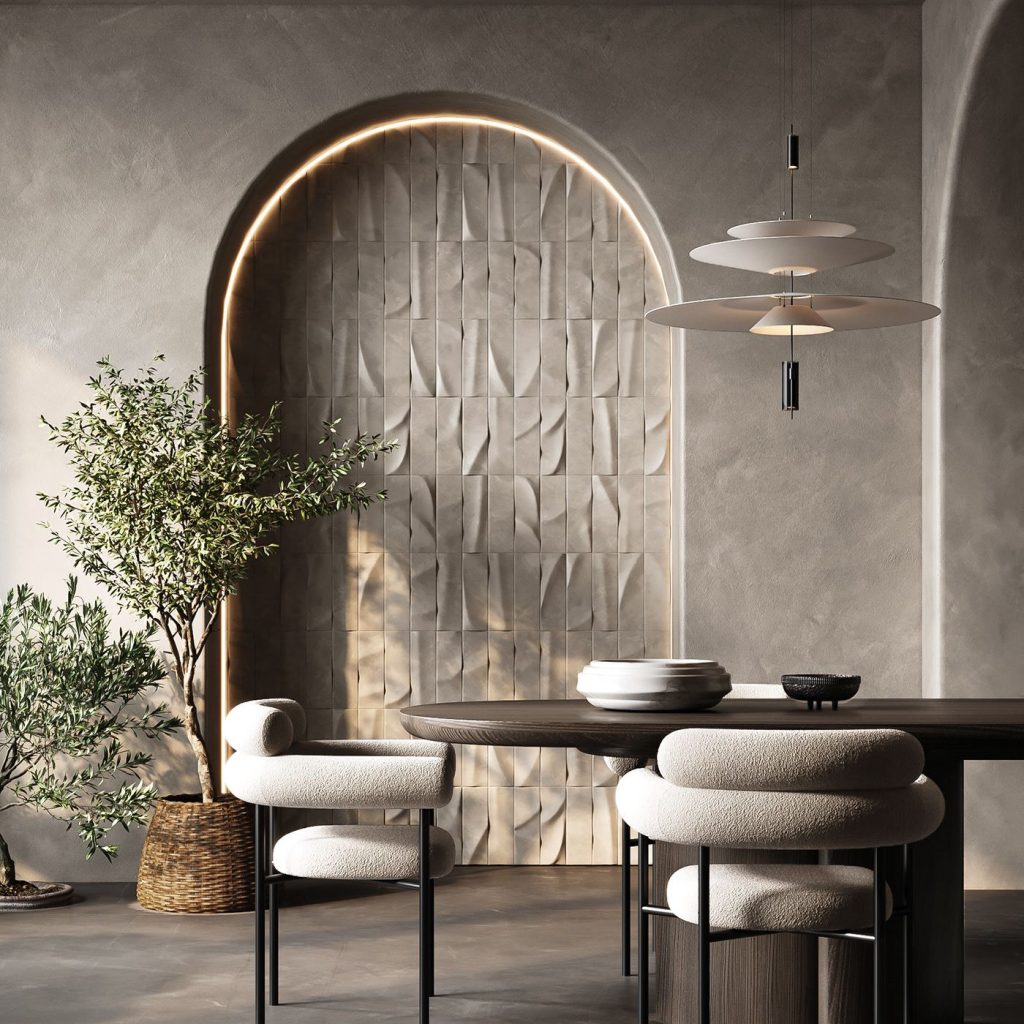 Nos projetos inspirados na arquitetura brutalista, predominam tons neutros e terrosos, que remetem à natureza e criam uma atmosfera acolhedora.